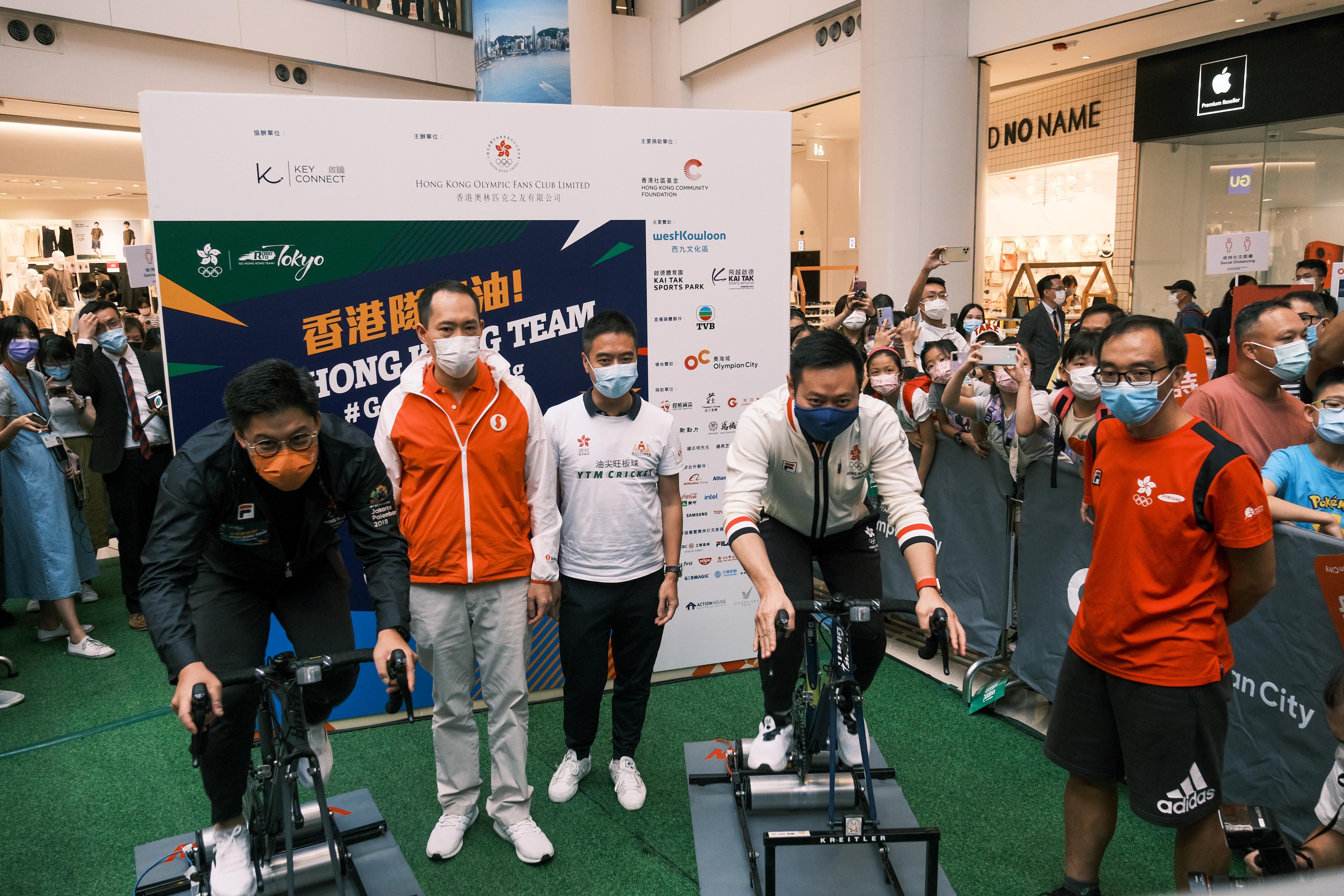 頂圖:民政事務局局長徐英偉(右三)和港協暨奧委會副會長霍啟剛(右二)到商場觀看賽事直播。