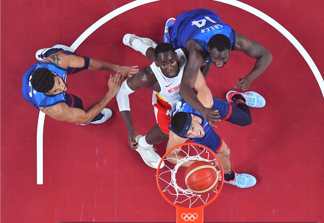 男籃四分之一決賽,美國戰勝西班牙晉級。圖為兩隊球員在籃下拚搶。新華社