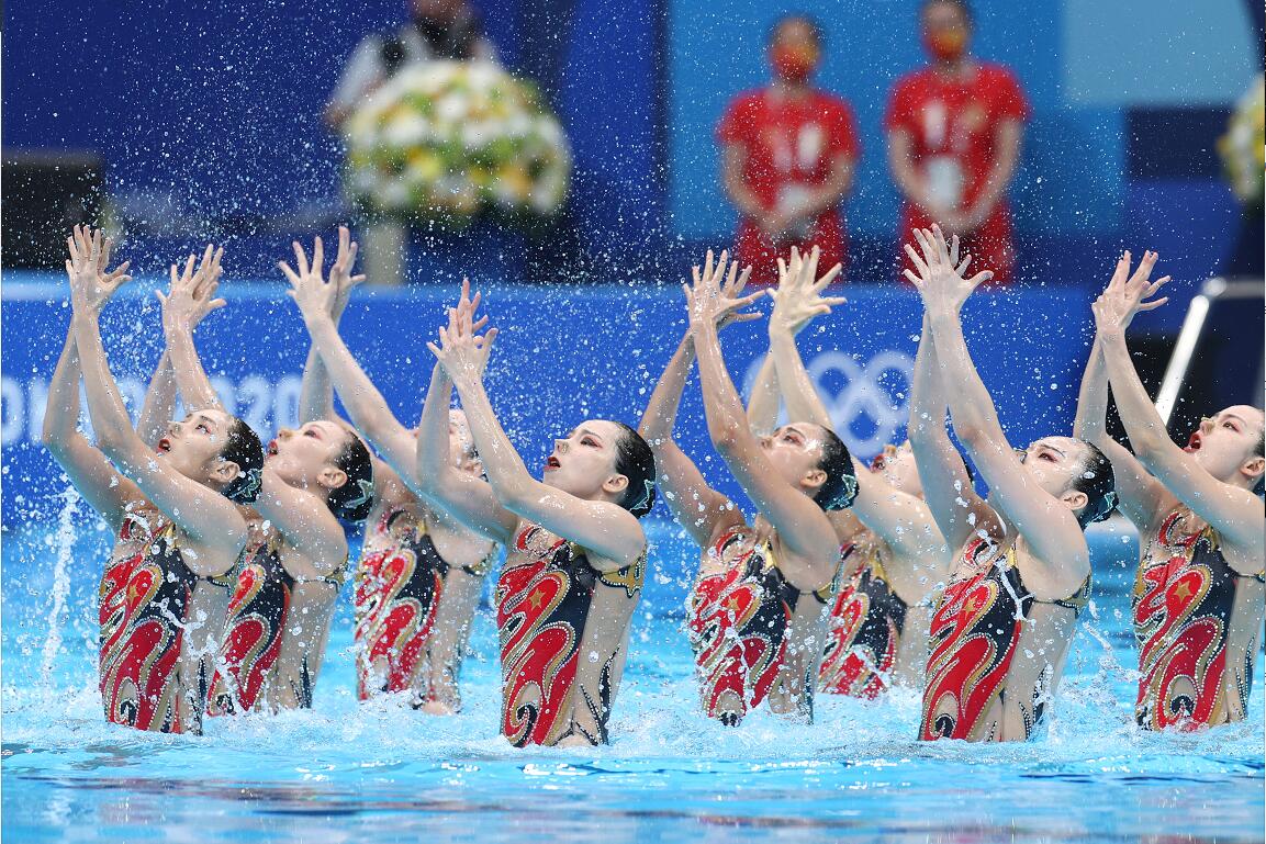 花樣游泳集體技術自選賽況,中國隊在比賽中。新華社