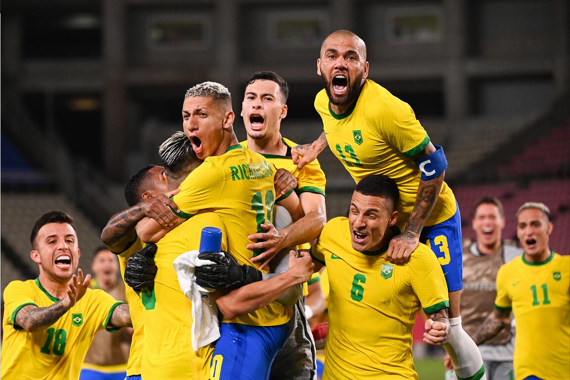 在東京奧運會男足半決賽中,巴西隊戰勝墨西哥隊,晉級決賽。圖為巴西隊球員在獲勝後慶祝。 新華社