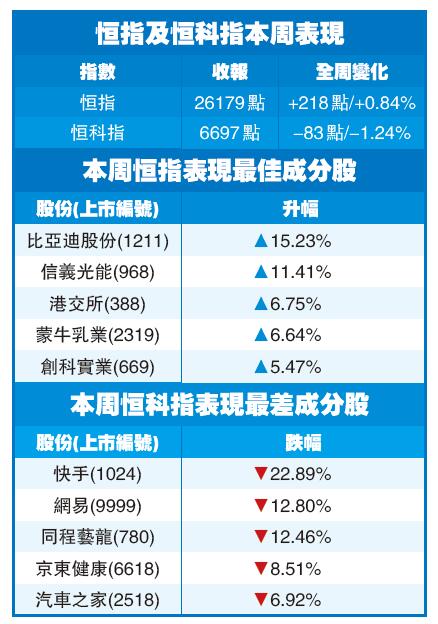 今日恒指收報26179點,跌25點,成交額1480億元,國企指數報9273點,跌22點,恒生科技指數報6697點,跌18點。總結全周,恒指累升218點,科網巨企跌幅收窄,監管重拳下,網絡視頻股及嬰兒奶粉股大挫,新能源車有追捧,比亞迪(1211)一周升成半,跑贏眾藍籌;而快手(1024)本周累挫22.8%。(記者姚一鶴)