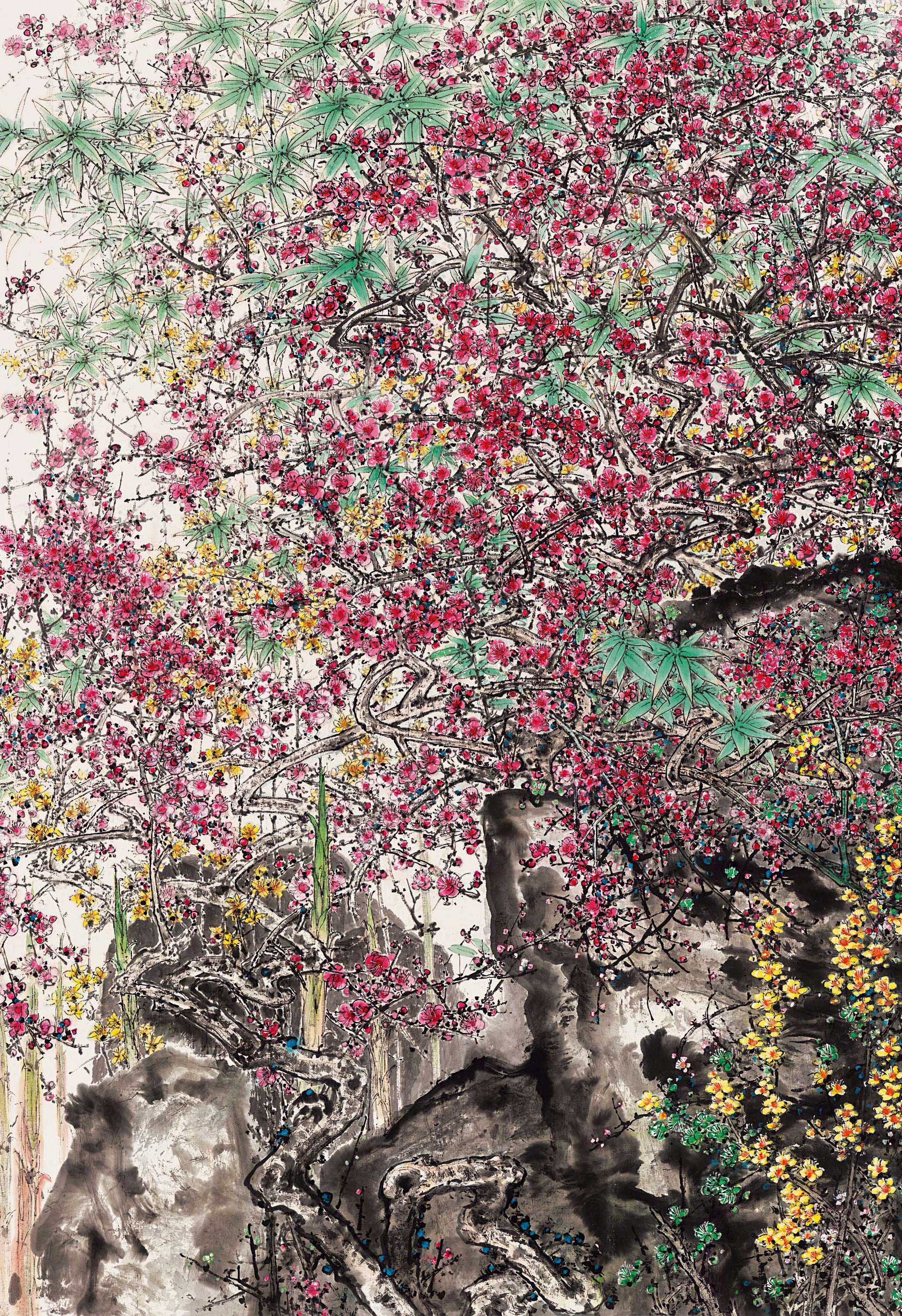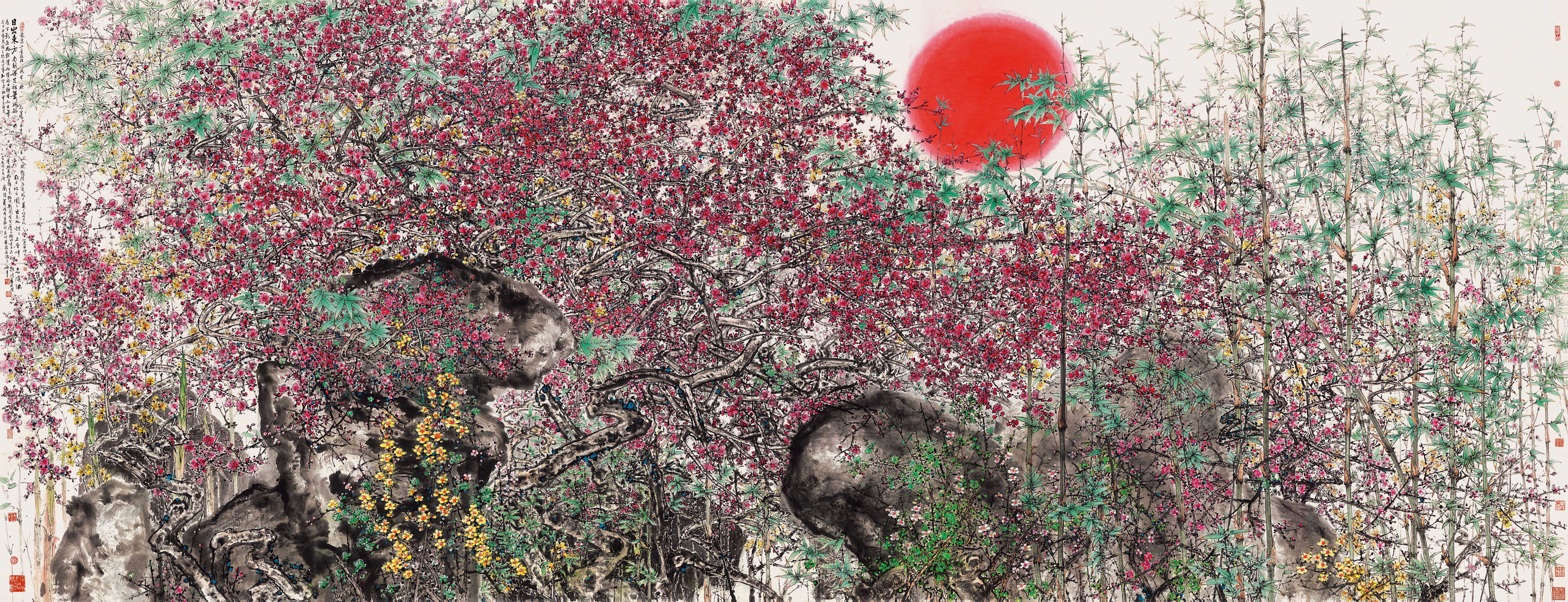 蕭暉榮擅畫繁梅,喜作大畫,這件《日出東方》畫作也延續了他一貫的畫風。畫中繁花密蕊,燦若雲霞;修竹幽雅,與紅梅兩相輝映,各具雅趣。兼之柱石林立,間有臘梅開放其間,更顯韻致深遠。畫的上方一輪紅日冉冉上升,使得整個畫面動靜相宜,疏密有度,富有層次感,氣勢磅礴,魅力攝人。