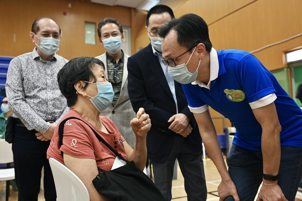 聶德權與在到場接種新冠肺炎疫苗的長者交談,旁為主辦活動的地區團體代表。