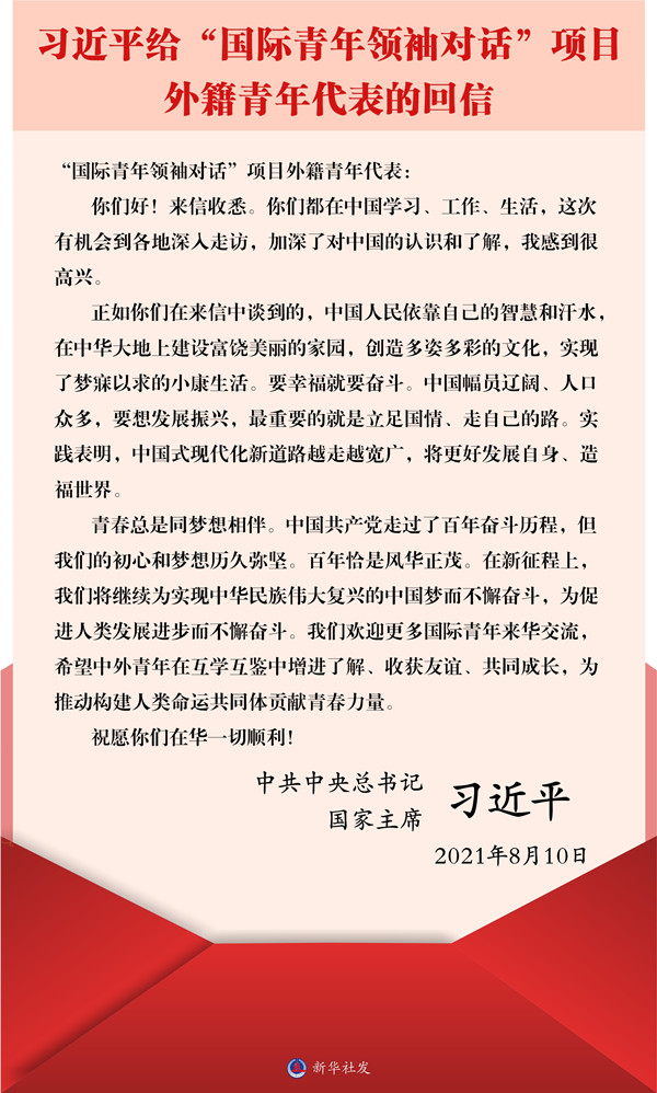 8月10日,習近平主席給「國際青年領袖對話」項目外籍青年代表回信,對他們積極到中國各地走訪、深化對華了解表示讚賞,鼓勵他們加強交流互鑒,為推動構建人類命運共同體貢獻青春力量。習近平主席的回信在外籍青年、國際交流各領域人士中引發熱烈反響,大家認為,回信承載著習近平主席對中外青年互學互鑒、共同成長的殷切希望,讓大家受到很大鼓舞。