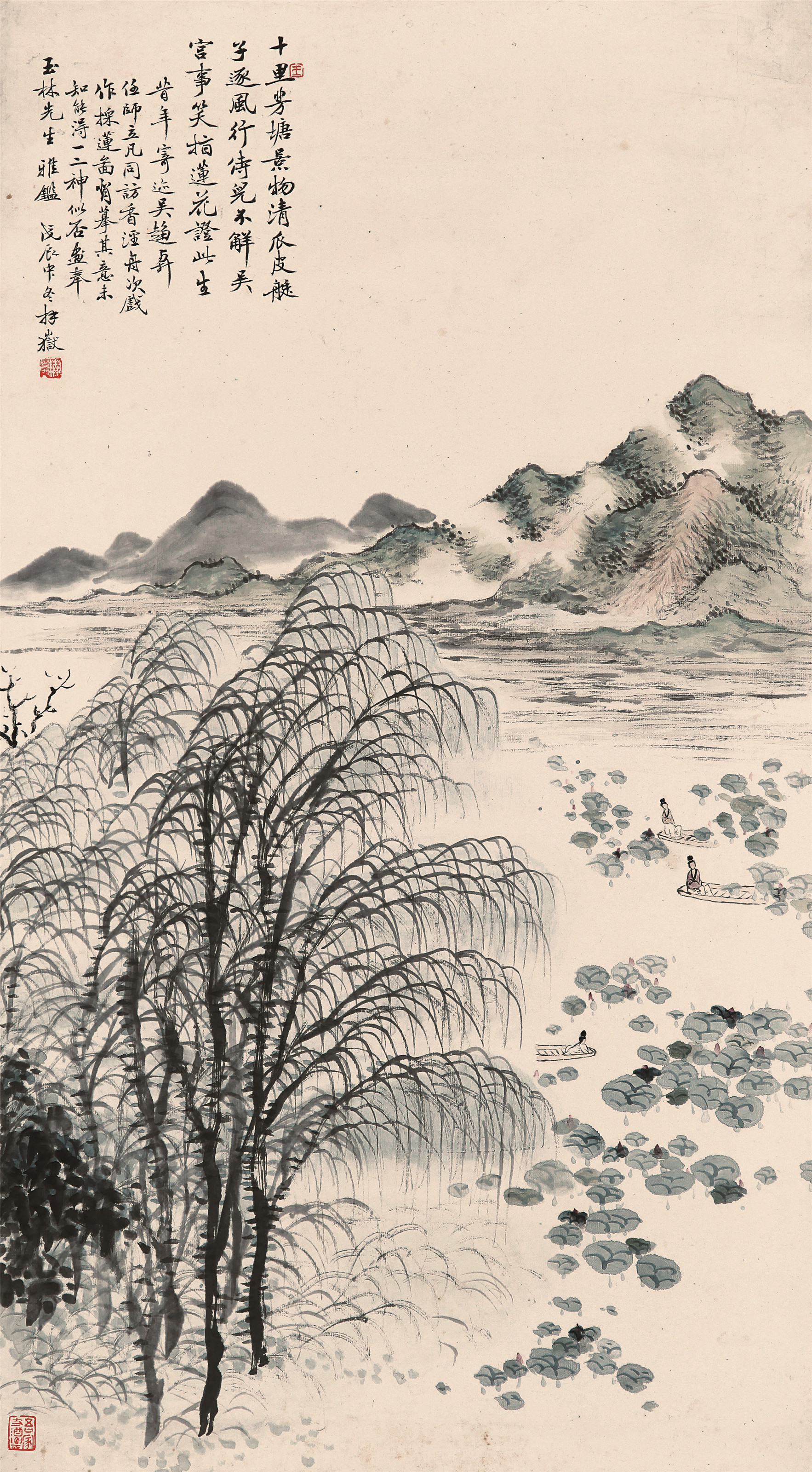 王林嶽的《採蓮圖》描繪了江南盛夏十里荷塘的景致。此圖畫面注重情趣和運筆脈絡,近處垂柳用筆線條極見功力,筆筆用心盡力,布局精心經營,整幅畫作天衣無縫,渾然一體,充分顯示了作者在構圖方面的高超能力,是一幅淡雅生動的江南採蓮圖。