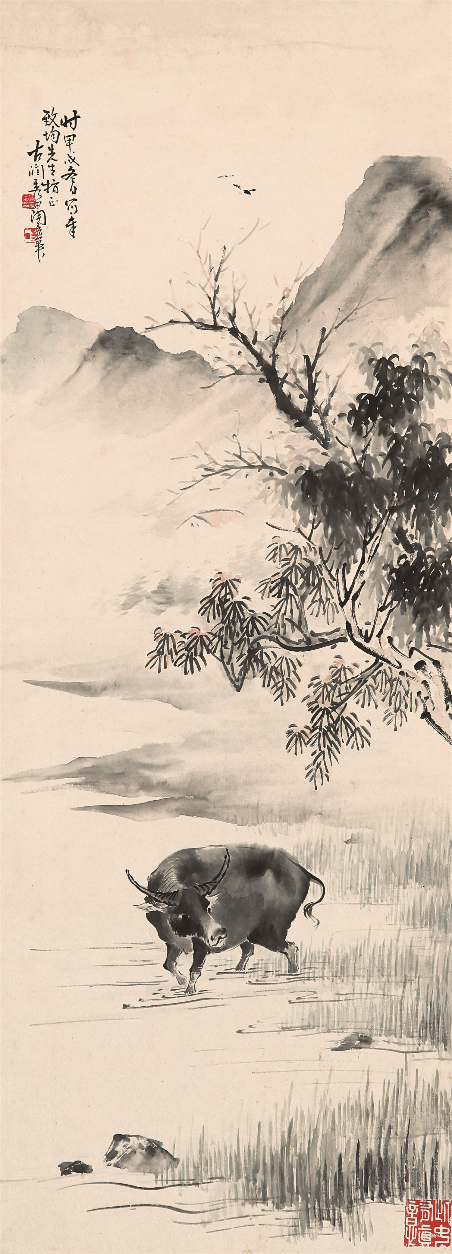 陶景華作品《榆蔭牧牛圖》,93.5x34cm。