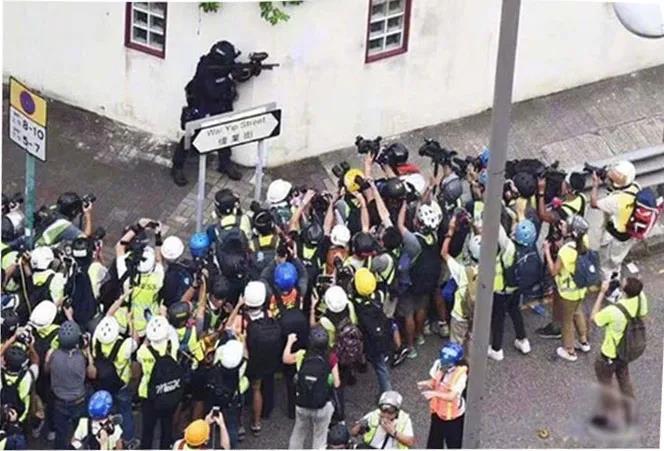 下面這張照片顯示,所有「黃媒」的鏡頭都只對准這一位香港警察,放大警察的行為,這位警察的一舉一動都成為一眾記者鏡頭捕捉的對象,卻對畫面另一端的暴徒暴行視若無睹。