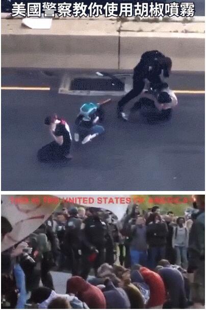 而同樣面對不反抗示威者,美國警察展示了「國際標准」的「胡椒噴霧使用教學方法」,將胡椒噴霧毫不留情地一再噴向已不能動彈的示威者。