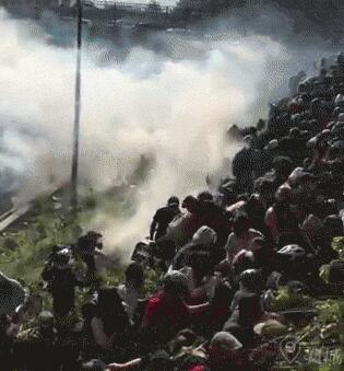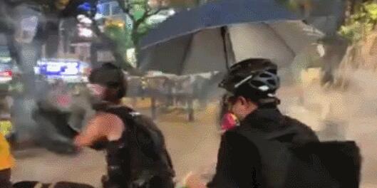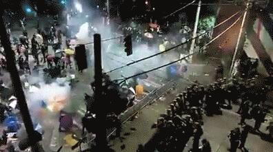 美國警方在驅逐示威者時,直接將示威者逼上路邊斜坡,並使用催淚彈煙熏
