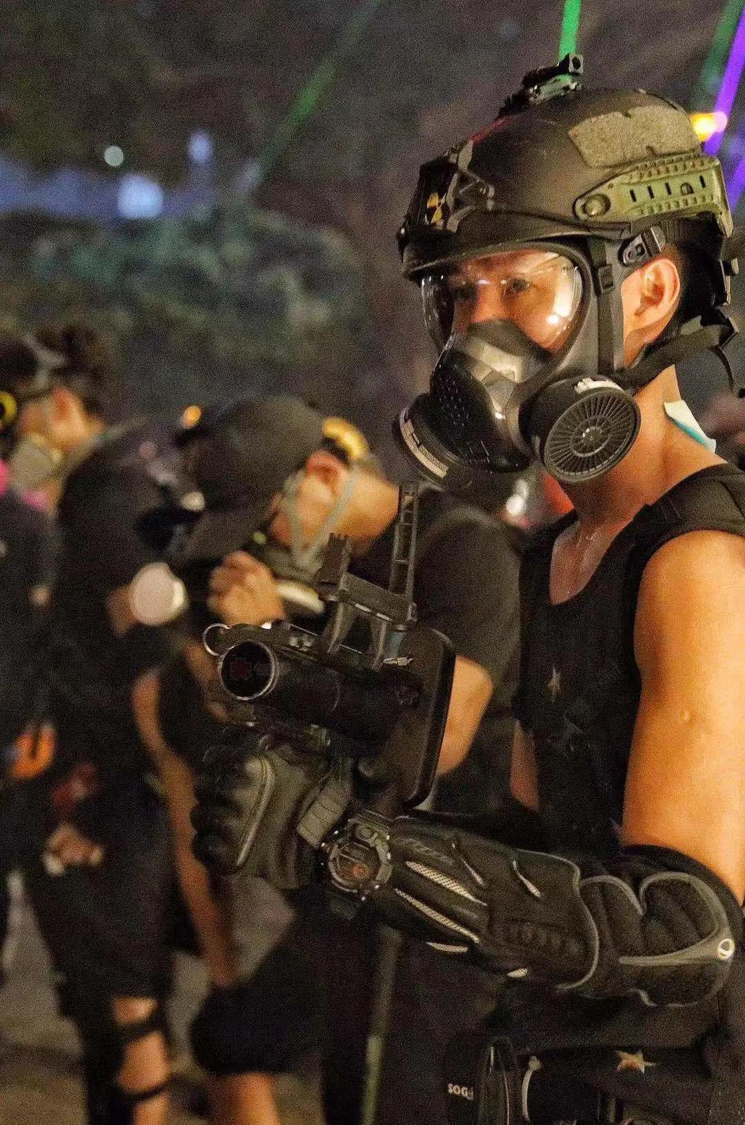 香港幾乎所有「示威者」都配備頭盔、眼罩、「豬嘴」(防毒面具),不少人更是一身「從頭武裝到落腳」的「標准衝擊裝備」,手上並持有行山杖、鐵通、汽油彈甚至手槍等凶器,再到土製炸彈,致命武器層出不窮,反映「訓練有素」。