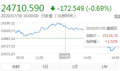 【香港商报网讯】7月30日,星期四,农历六月初十。今日恒指高开低走,尾盘跳水大跌1%,截至收盘,恒指跌0.69%,报24710.59点。国企指数跌0.86%,红筹指数跌0.33%。