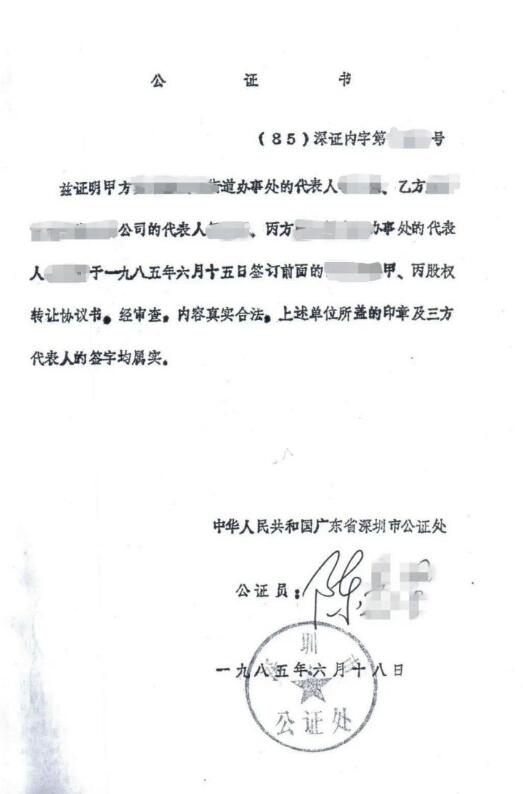 1985年,深圳股權制商業模式業已成熟,深圳公證處辦理了全國第一份股權轉讓協議公證。該公證確認了甲乙雙方需要承擔的義務和權利,避免了轉讓方與受讓方出現不必要的糾紛。