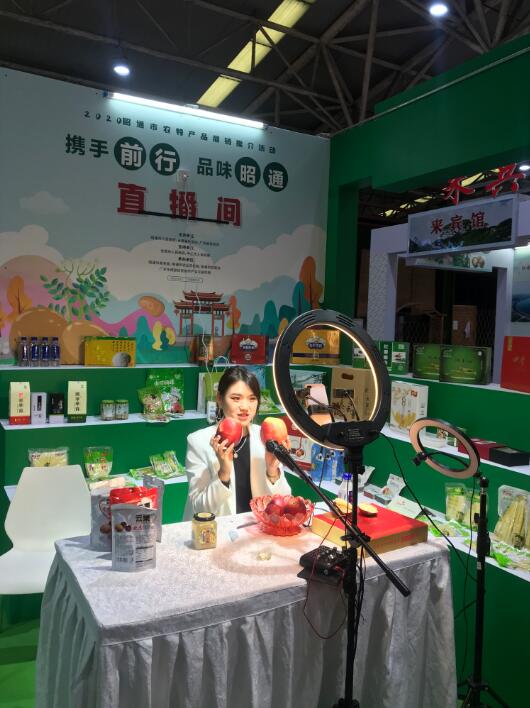 展商在推介活動期間同步開啟線上直播,銷售農特產品昭通大紅蘋果。(徐紅 攝)