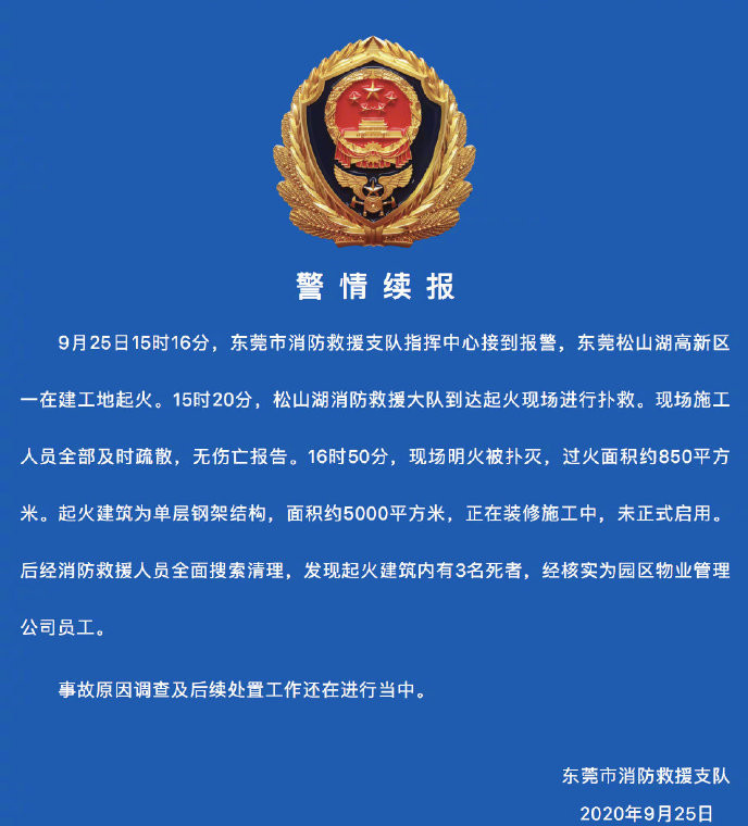 16時50分,現場明火被撲滅,過火面積約850平方米。起火建築為單層鋼架結構,面積約5000平方米,正在裝修施工中,未正式啟用。后經消防救援人員全面搜索清理,发現起火建築內有3名死者,經核實為園區物業管理公司員工。事故原因調查及后續處置工作還在進行當中。