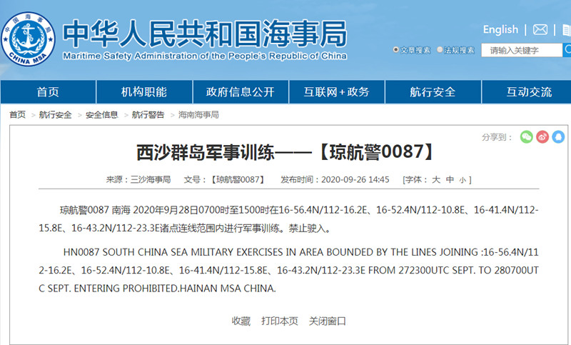 海南三沙海事局26日发布航行警告:2020年9月28日7時至15時在西沙群島16-50.6N/112-21.0E、16-57.5N/112-21.6E、16-56.0N/112-26.1E、16-52.1N/112-28.0E諸點連線範圍內進行軍事訓練,禁止駛入。