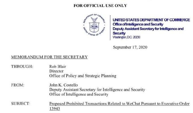 報道指,美國司法部近日向法院遞交政府內部文件,包括一份9月17日美國商務部部長簽署的關於WeChat的18頁報告,文件首次披露騰訊向美國政府提出多項針對WeChat用戶數據安全疑慮的建議。