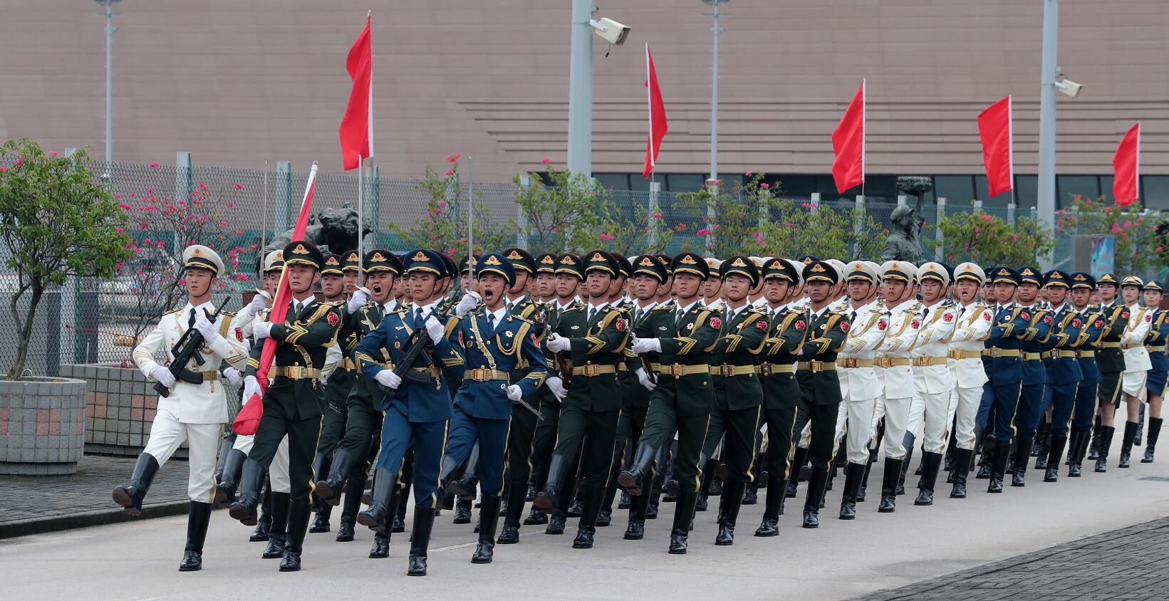 「升國旗!奏國歌!」伴隨著升國旗儀式開始,從大帽山下到維港之畔,從空軍場站到海軍基地,在赤柱、新圍、九龍、石崗遍佈全港的座座軍營,一面面五星紅旗迎風招展,標定出人民軍隊的神聖哨位。