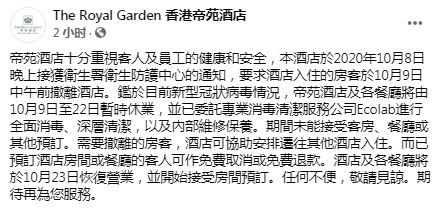 帝苑酒店今日(9日)於其社交專頁公布,接獲衞生署衞生防護中心通知,要求酒店入住的房客於10月9日中午前撤離酒店,而帝苑酒店及各餐廳將由10月9日至22日暫時休業,直至23日恢復營業。酒店已委託專業消毒清潔服務公司進行全面消毒、深層清潔,以及內部維修保養。