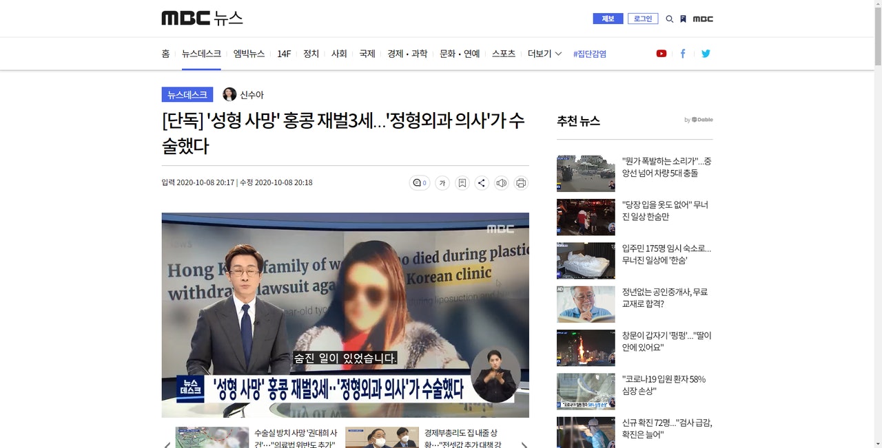 韓國文化廣播電台獨家報道羅貝兒死亡調查的最新進展,警方指涉事整容診所的職員醫療失當。