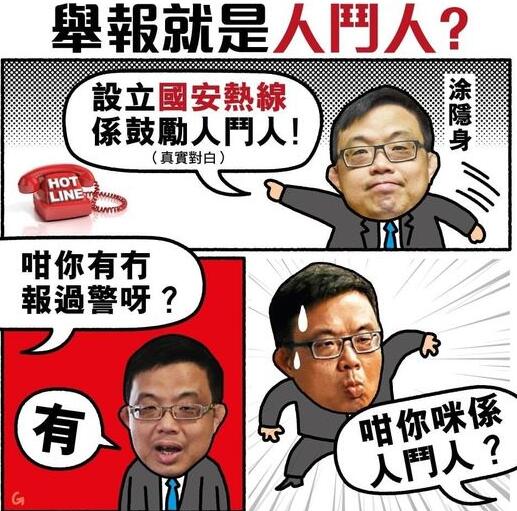 李梓敬在貼文附上一張圖片,內容涉及民主黨立法會議員塗謹申對國安熱線的評論。而李梓敬則在貼圖反問對方有沒有報警的經驗及報警的行為是否與國安熱線一樣是「人鬥人」。(記者 唐信恒)