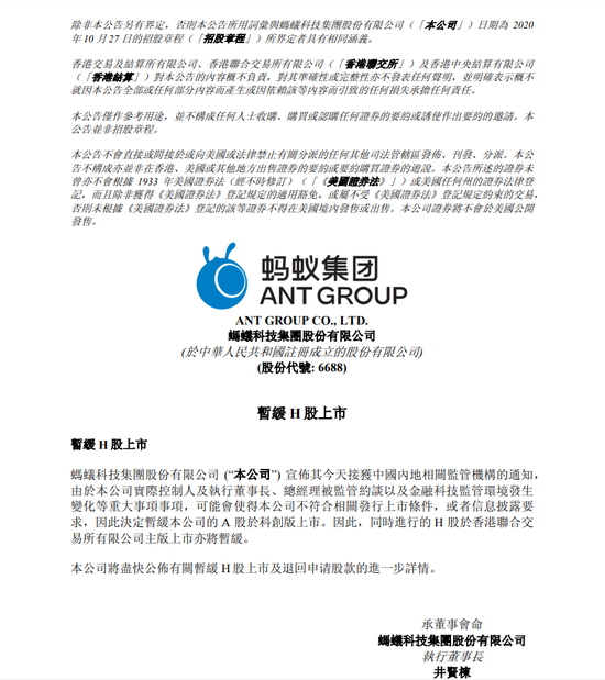 3日晚間,螞蟻集團港交所公告,暫緩H股上市。港交所就此回應指,今天接獲螞蟻集團通知,其決定暫緩在上海及香港的上市,香港交易所不評論個別上市申請或發行人。港交所又指,香港仍然是亞洲首屈一指的國際IPO市場,今年已經歡迎超過120家公司上市。而中概股回歸、區域及本地的上市申請仍然活躍,港交所期待並歡迎亞洲及國際的發行人及投資者參與港股市場。