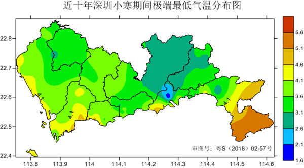 近十年,小寒時節深圳極端最低氣溫主要出現在鹽田區北部(極端最低1.6℃)、龍崗區北部(極端最低2.8℃)和坪山區西部(極端最低2.8℃)。
