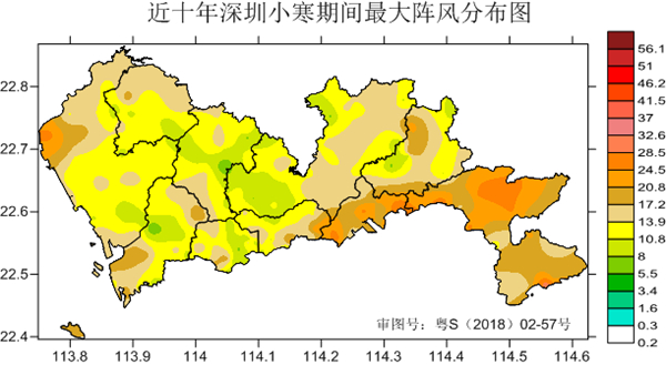 從近十年深圳小寒期間最大陣風分布圖看出,深圳最大陣風主要在大鵬新區和鹽田區,沿海和高地最大陣風可達10-11級。
