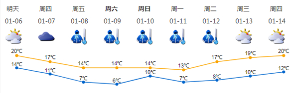 7日受冷空氣影響,雲量增多,最低氣溫降至11℃左右,日溫差小;8日最低氣溫降至7℃左右;9-12日最低氣溫維持在10℃以下,寒冷天氣持續;7-8日沿海、高地及海區最大陣風6-7級。
