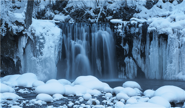 東北少瀑布,最大的長白山瀑布落差也不過70米。作為長白山瀑布群的小老弟,只有10米寬,7米落差的吊水壺瀑布與宏偉壯觀沒有任何關聯。但是這裏的四季分明,景色截然不同。吊水壺瀑布主瀑布平整方正,又如人工雕琢的一樣稜角分明。在主瀑布的西側,有一處水洞,河水因壓力穿過石洞形成噴泉狀,自崖中間淩空噴下,就象茶壺中的水從壺嘴中倒出來一樣,故當地人稱其為「吊水壺」。吊水壺瀑布就在這片林海雪原中,河水一年四季奔騰不息,到了冬季也不結冰,在早晚的低色溫下,冰瀑一片幽藍,宛如童話一般。