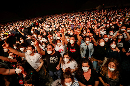 遊行終點的舞台前,韓裔青少年敲打傳統大鼓,伴隨激昂的阿里郎音樂獲得全場歡呼。街道遠方是洛杉磯著名的天際線,人群中各色標語出籠,可看到中華民國國旗。