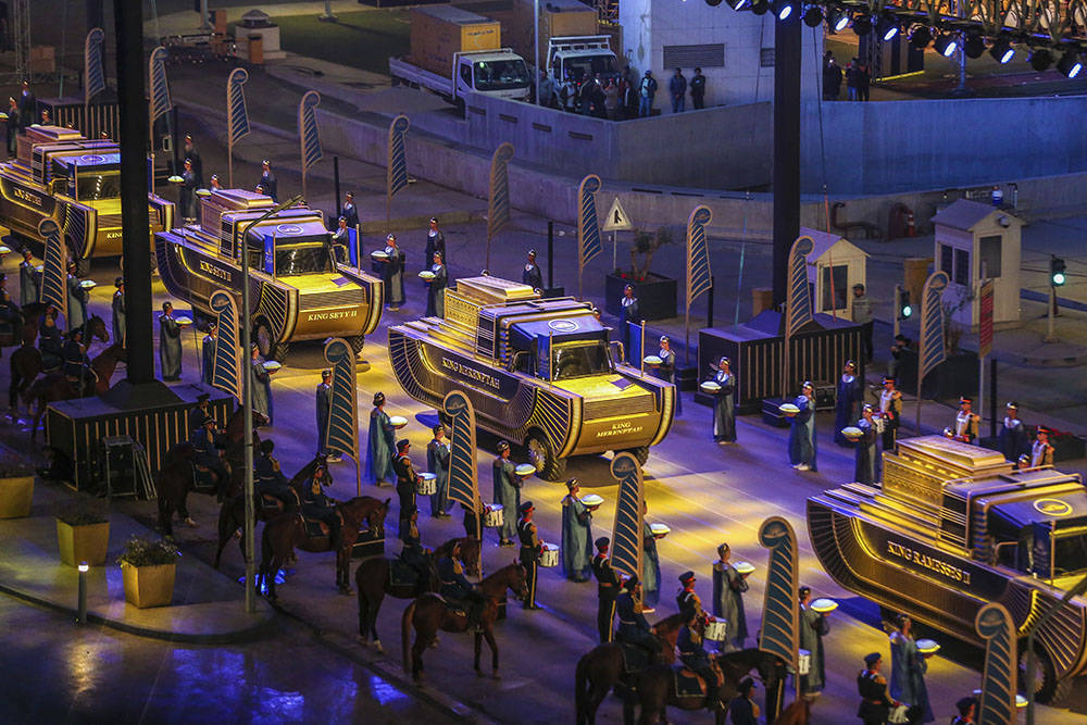 埃及總統塞西、總理馬德布利、旅遊和文物部長阿納尼等出席了當晚的交接儀式,埃及文明博物館當天正式啟用。埃及政府希望新開放的埃及文明博物館能夠幫助振興旅遊業,22具埃及法老和王后木乃伊將被放置於該博物館的皇家木乃伊大廳,並將於4月18日開始向公眾展示。(圖源:路透社)