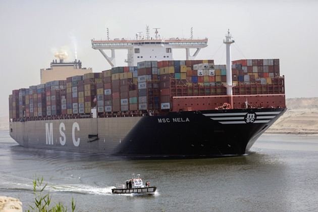 頂圖:當地時間周二,一艘貨船在復航後的蘇伊士運河上航行。運河近期曾因「長賜號」擱淺事故而被阻塞近一周。(路透社)