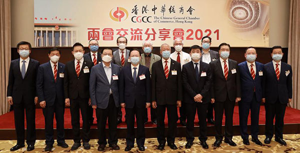 香港中華總商會日前舉辦「兩會交流分享會2021」。中聯辦副主任譚鐵牛應邀擔任主旨演講嘉賓,分享今年兩會重要精神與政策方向。中總會長袁武代表該會致歡迎辭。全國人大常委譚耀宗,全國政協常委、中總永遠名譽會長蔡冠深擔任專題演講嘉賓,暢談會議對香港帶來的啟示,以及對完善香港選舉制度的意見。