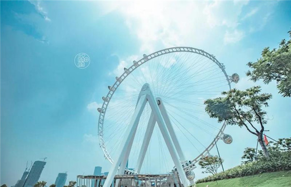 「灣區之光」摩天輪總高128米,採用世界首創的魚鰭狀異形大立架,乘坐一圈耗時30分鐘左右。摩天輪共設有28個可容納25人的橢球迴轉式太空艙,是國內最大的全天景迴轉式轎廂,未來還將提供「雲端聚會」、「空中婚禮」、「定製生日派對」等高空體驗項目。