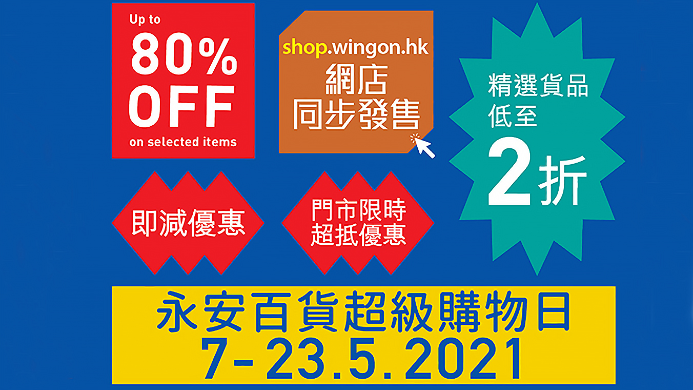 永安百貨於5月7日至23日推出「超級購物日」及「門市限時超低優惠」,優惠商品包括電器用品、廚房用品、家庭用品、鞋履手袋、化妝品、服裝、食品等,精選貨品低至2折起售。同時,還派發現金優惠券。