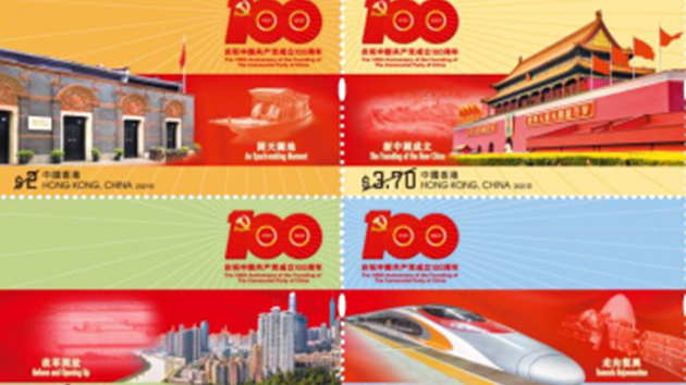 率先隆重登場的是以「中國共產黨成立一百周年」為題的紀念郵票。中國共產黨於1921年7月成立,為慶祝其成立一百周年,香港郵政將以此為題,於7月1日(星期四)發行一套四枚郵票及一張郵票小型張。郵票及郵票小型張引用了中國共產黨成立一百周年慶祝活動的唯一官方指定標識,包括圖案及主題名稱引用於郵票設計內,而標識內之56根光芒線寓意中國共產黨奮進之光照耀中華大地。郵票將光芒線延伸,在紅紅的黨旗飄揚下,串連每一枚郵票,分別展示黨領導新中國的成立和發展,實現為人民謀幸福、為民族謀復興、為世界謀大同的目標。香港在中國共產黨和中央政府的領導下,成功落實「一國兩制」,香港作為特別行政區,得以維持繁榮安定,並融入國家發展的大局。