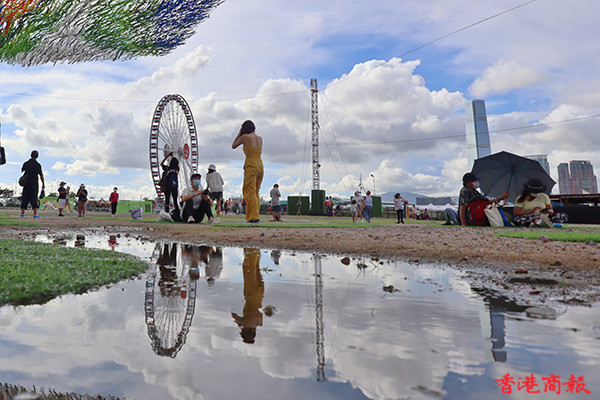這幾天都下著雨,在中環海濱公園出現一灘小小的積水,別人眼中可能是平平無奇,但就讓攝影愛好者發現了美景的新角度,有的蹲著、有的俯伏在地上,希望拍到心儀的「天空之鏡」,拍得不亦樂乎,只要細心觀察,其實美景就在身邊。(馮瀚文 攝)