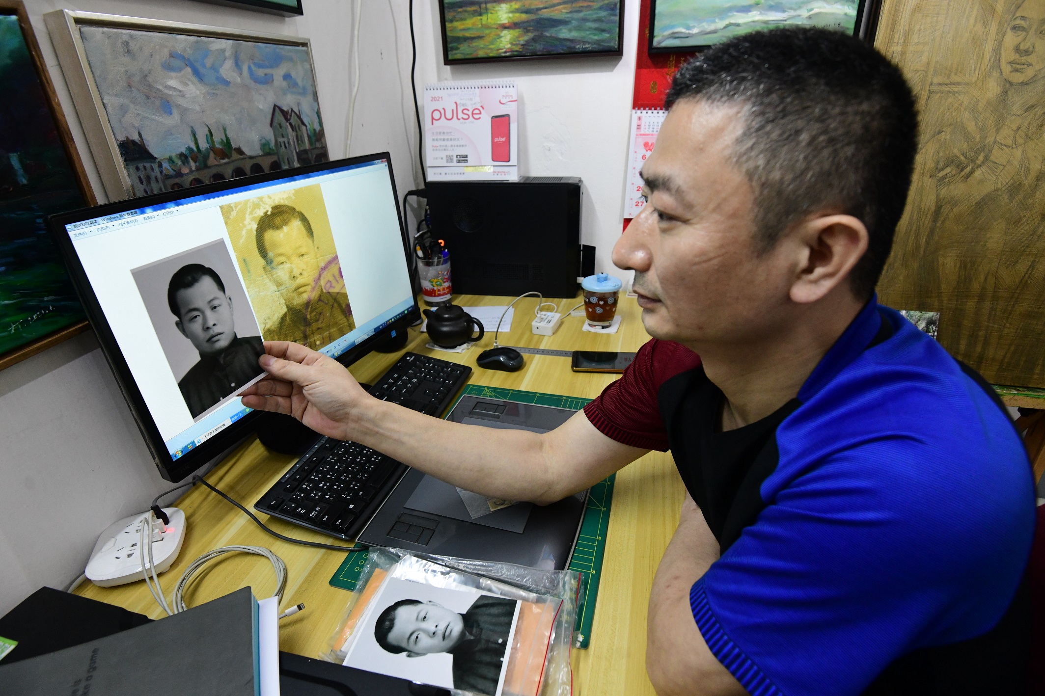 柯銘峰的職業相當冷門,在香港從事這一行業的人並不多。走進工作室,兩旁掛滿畫作及舊照,辦公桌上只有一部電腦、一個電腦手繪畫板及掃描器,若不知就裏,會以為眼前人是個平面設計師,或是舊照收藏家。工作室主人翁柯銘峰笑迎接記者,介紹自己的職業——照片修復師,並娓娓道來一個又一個與客人的故事……