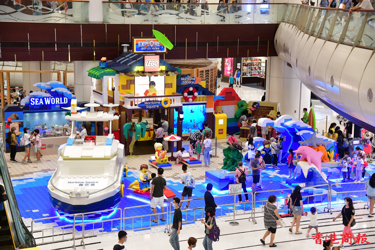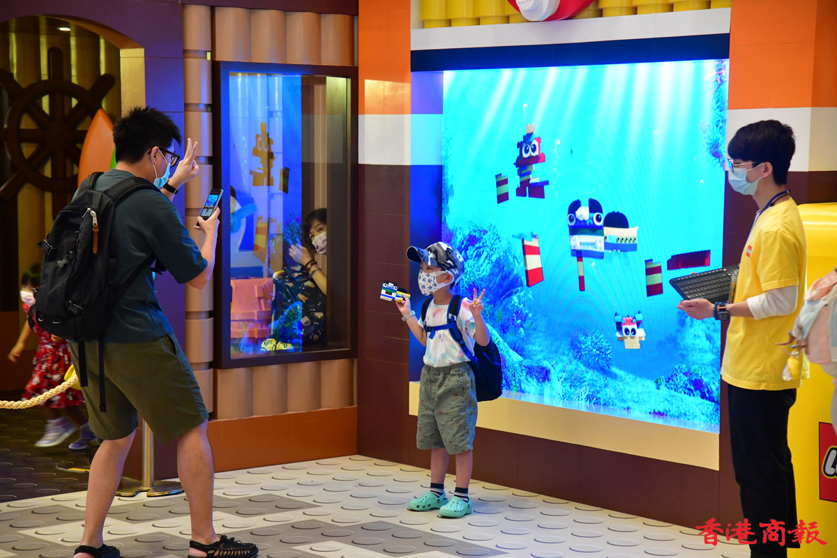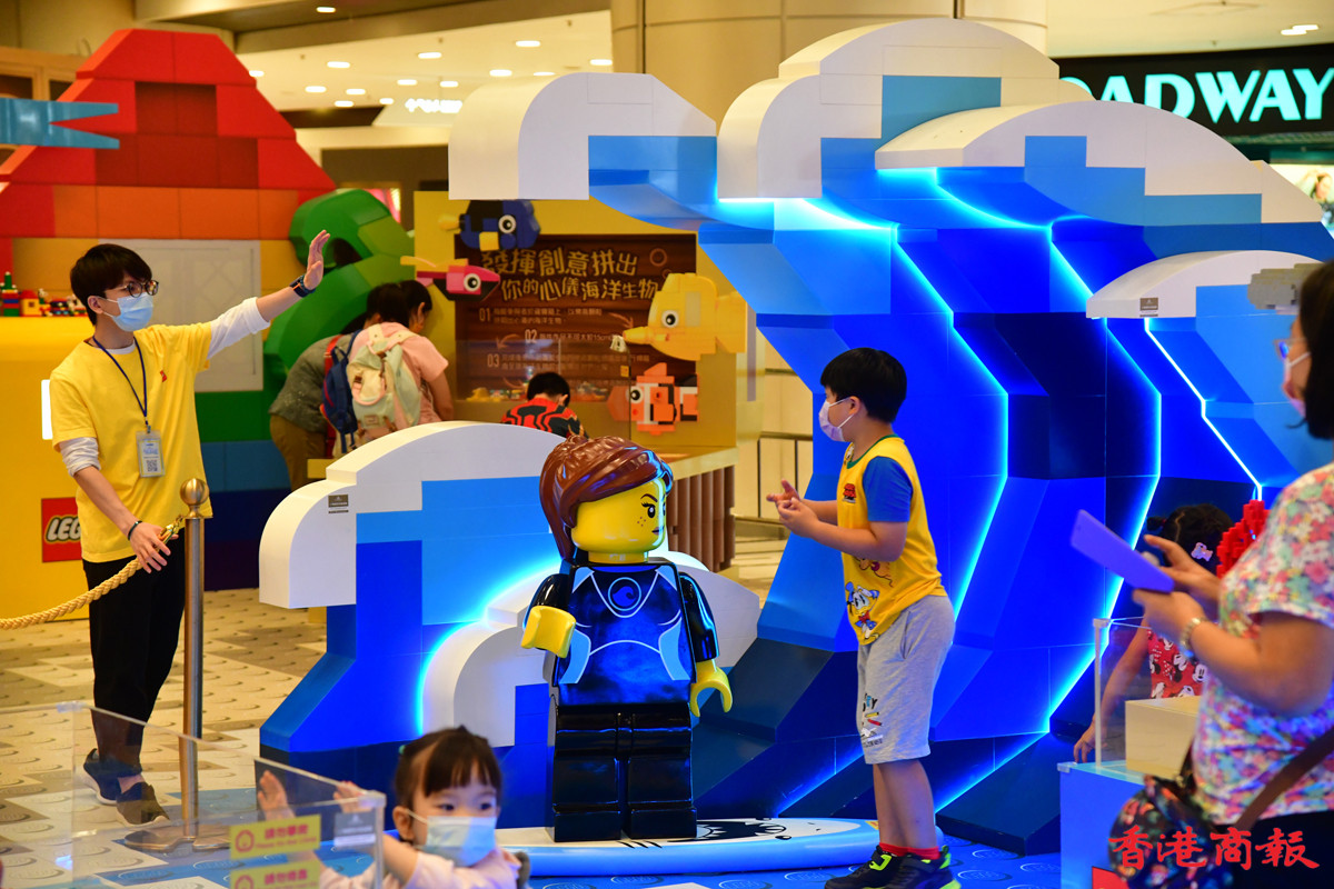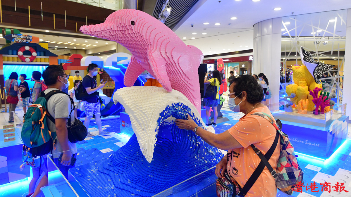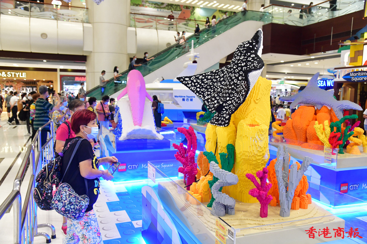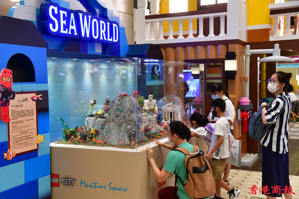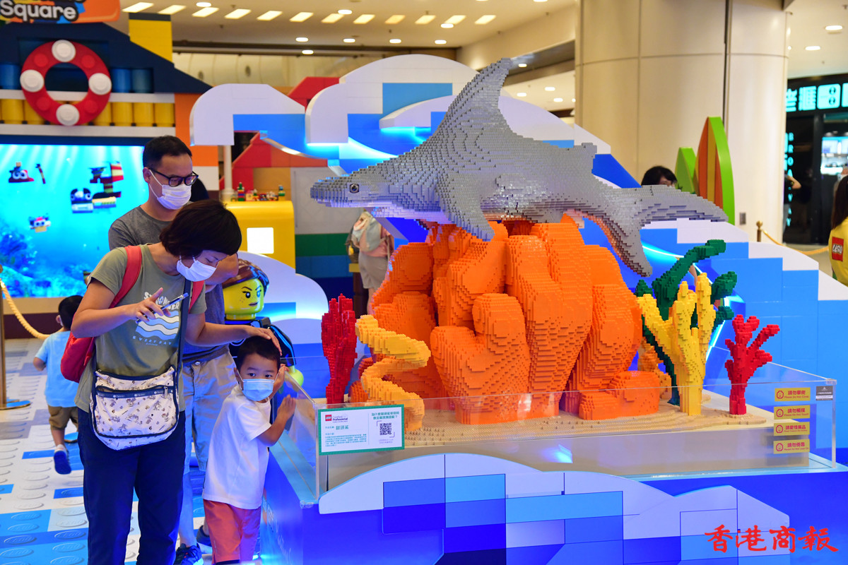 近日多個大型商場展示多款LEGO模型裝置,其中青衣城的海底世界展區,吸引不少學童到來大開眼界。砌模型不只小朋友情有獨鍾,連父母也愛不惜手,很想擁有一副模型逐塊拼砌去重拾兒時回憶。(記者 崔俊良攝)