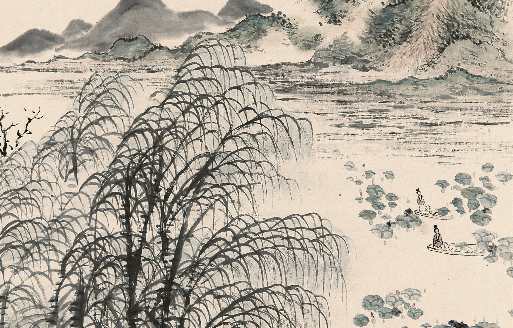 王林嶽的《採蓮圖》描繪了江南盛夏十里荷塘的景致。此圖畫面注重情趣和運筆脈絡,近處垂柳用筆線條極見功力,筆筆用心盡力,布局精心經營,整幅畫作天衣無縫,渾然一體,充分顯示了作者在構圖方面的高超能力,是一幅淡雅生動的江南採蓮圖。
