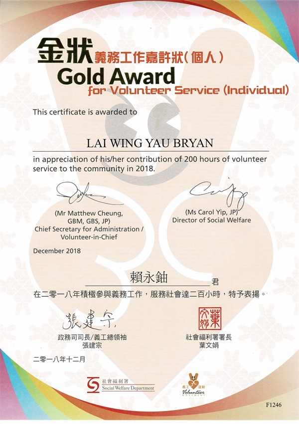 推動企履社會責任獲得義務工作嘉許狀個人金狀。