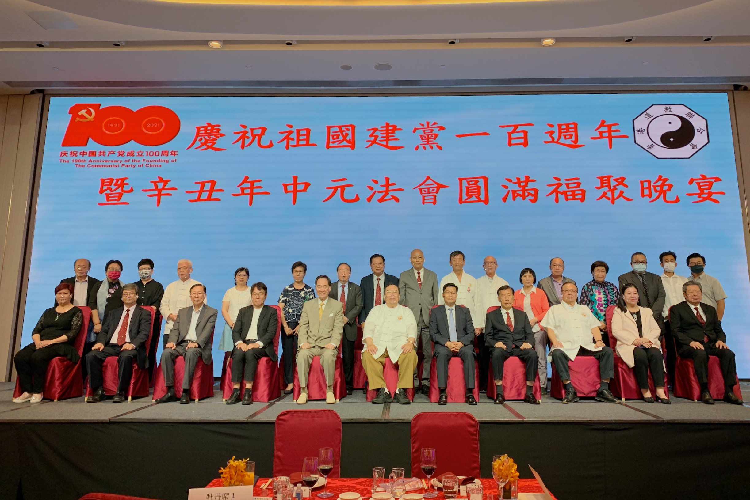 香港道教聯合會3日假荃灣如心酒店舉辦「祝賀祖國建黨一百周年暨辛丑年中元法會圓滿福聚晚宴」。中聯辦協調部副部長陳澤濤、協調部宗教處處長李永戰,港區全國人大代表、香港教育工作者聯會會長黃均瑜與新界鄉議局副主席林偉強應邀主禮。該會主席梁德華冀通過法會宣傳孝道文化,弘揚中華傳統。逾300位本港各界道友出席活動,氣氛熱烈。