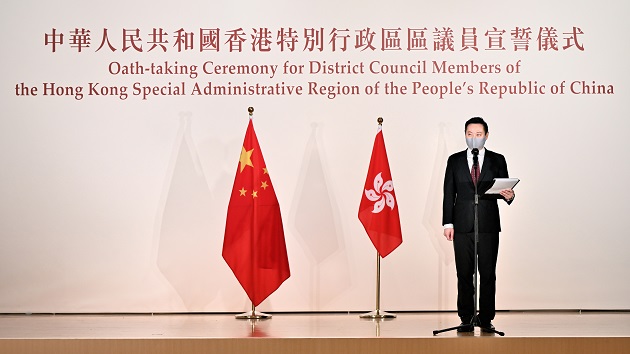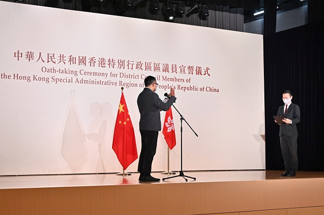 港府今日在北角社區會堂舉行中西區區議會、灣仔區議會、東區區議會和南區區議會的區議員宣誓儀式。在宣誓儀式上,出席的區議員逐一宣誓擁護《基本法》、效忠特區,並由民政事務局局長徐英偉作為行政長官授權的監誓人監誓。