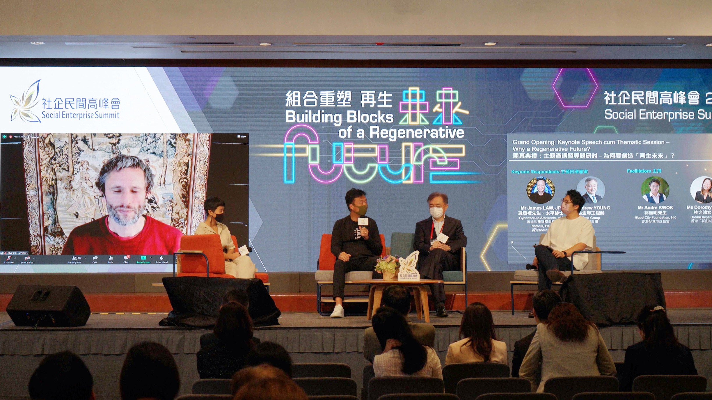《Sacred Economics: Money, Gift, and Society in the Age of Transition》的作者Charles EISENSTEIN透過視訊參與「主題演講暨專題研討」,剖析了人口結構、經濟發展、生態系統步入成熟期與「再生未來」的關係,並討論多個宏觀經濟及社會政策如何讓社會過渡至「再生未來」。香港科建國際集團創辦人及行政總裁羅發禮,以及信和集團創新聯席董事楊孟璋擔任主題研討嘉賓,分享他們對「再生未來」的見解。