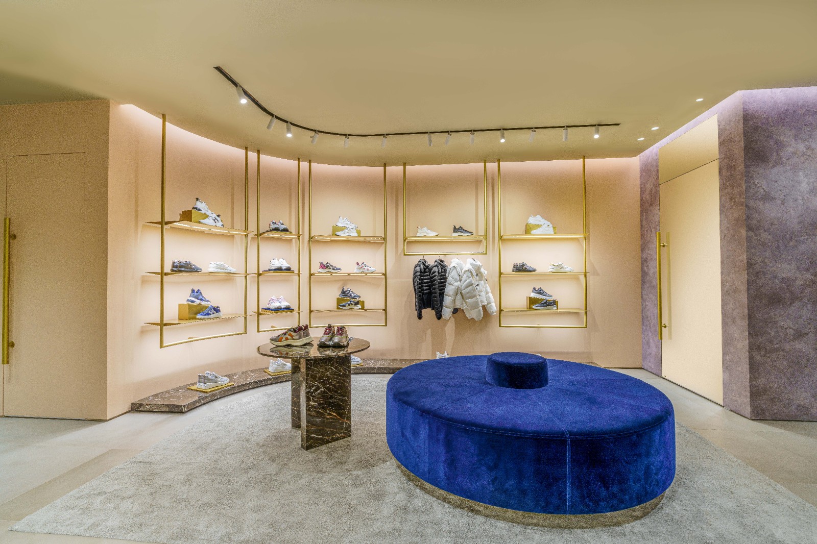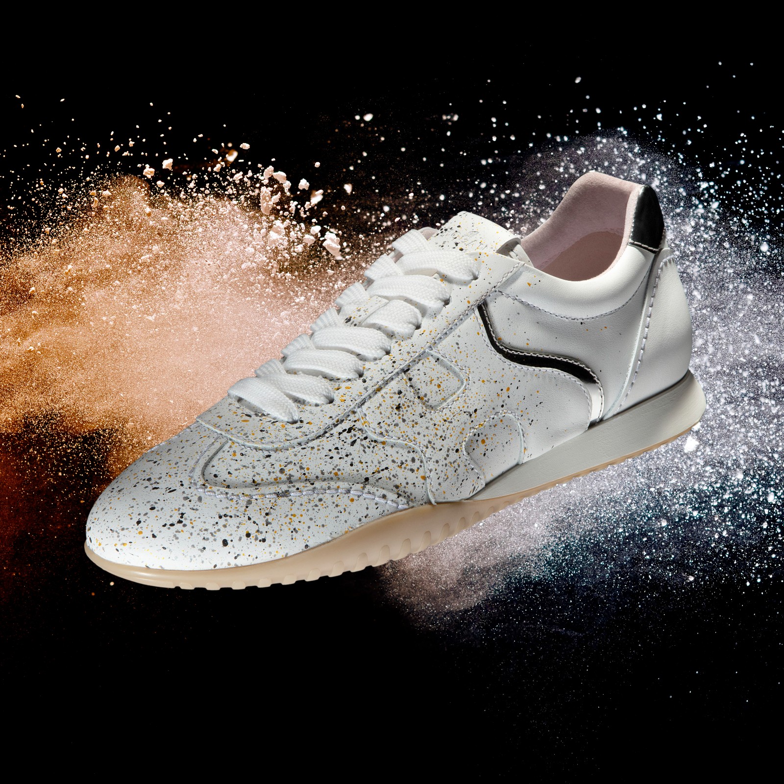 全新女裝Olympia Z款式運動鞋為概念店限定版鞋款,設計受工業風啟發,以嶄新元素重塑經典鞋款。以觸感順滑的小牛皮搭配麂皮製造,並加上鏡面金屬潤色。而車線和鞋底則配以淺淡自然色調,鞋墊為穿感舒適的記憶棉,配上橡膠鞋底,並加入黑銀金的潑墨效果,令鞋型更獨特、更富動感。
