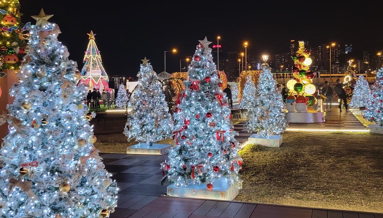 充滿經典紅色綠色大型聖誕波波的聖誕樹會在金鐘添馬海濱長廊閃耀。