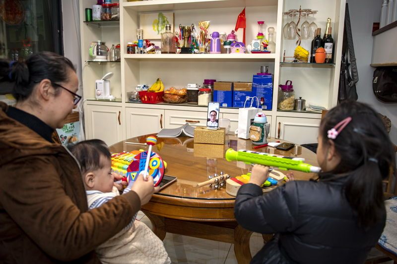 晚上9點,吳可君家在開一場家庭音樂會。6歲的女兒童童用豎笛吹著《歡樂頌》,兒子辰辰坐在外公腿上,吳可君彎腰把著辰辰的小手敲擊玩具鍵盤。