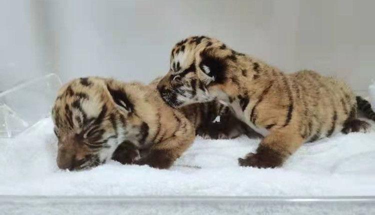 2021年12月31日深夜,廣東省韶關市華南虎繁育研究基地,華南虎「夢夢」順利產下兩隻華南虎雌性幼崽,重量均為990克。這也是繼2021年3月和9月迎來「圓圓」和「慶慶」兩隻雌性虎寶寶後,該繁育研究基地年內再次「迎新」。兩隻華南虎寶寶的出生也創下了「一年內三胎」的高產紀錄。
