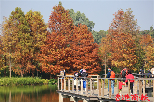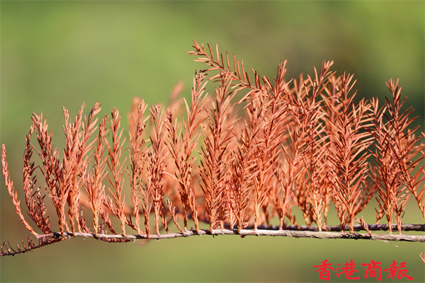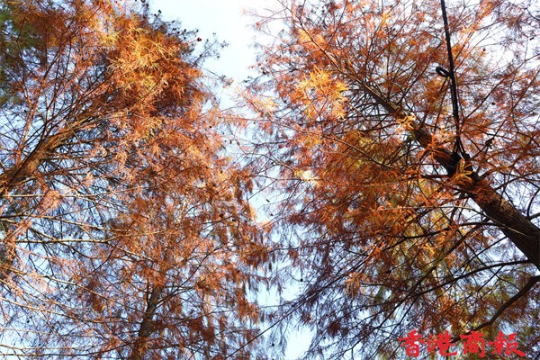 繼楓葉後,落羽松是香港冬天最火紅的植物,它的葉子呈針狀,微風送爽下,仿似輕柔的羽毛般隨風擺動。縱然落羽松與楓葉的外形大相逕庭,卻同為會變色的植物,踏入秋冬,便會發出金黃的光芒,然後脫變成香橙的顏色,最後達至褐紅。就是這種迷幻的色彩,使人如癡如醉。
