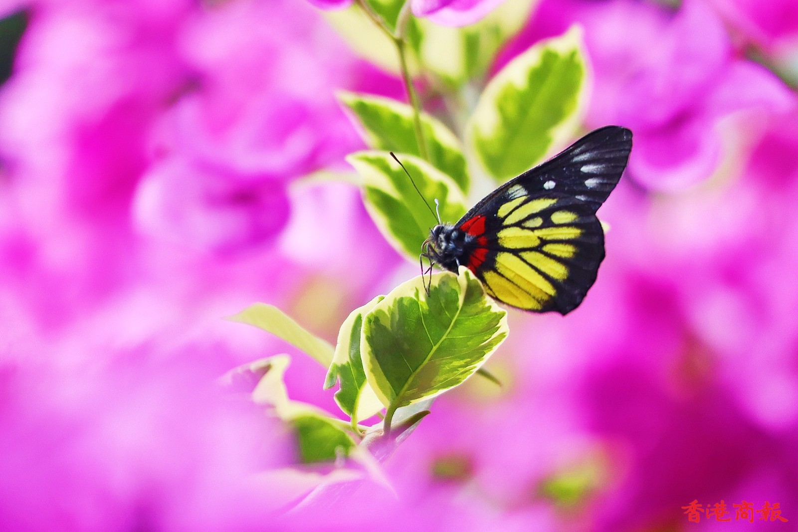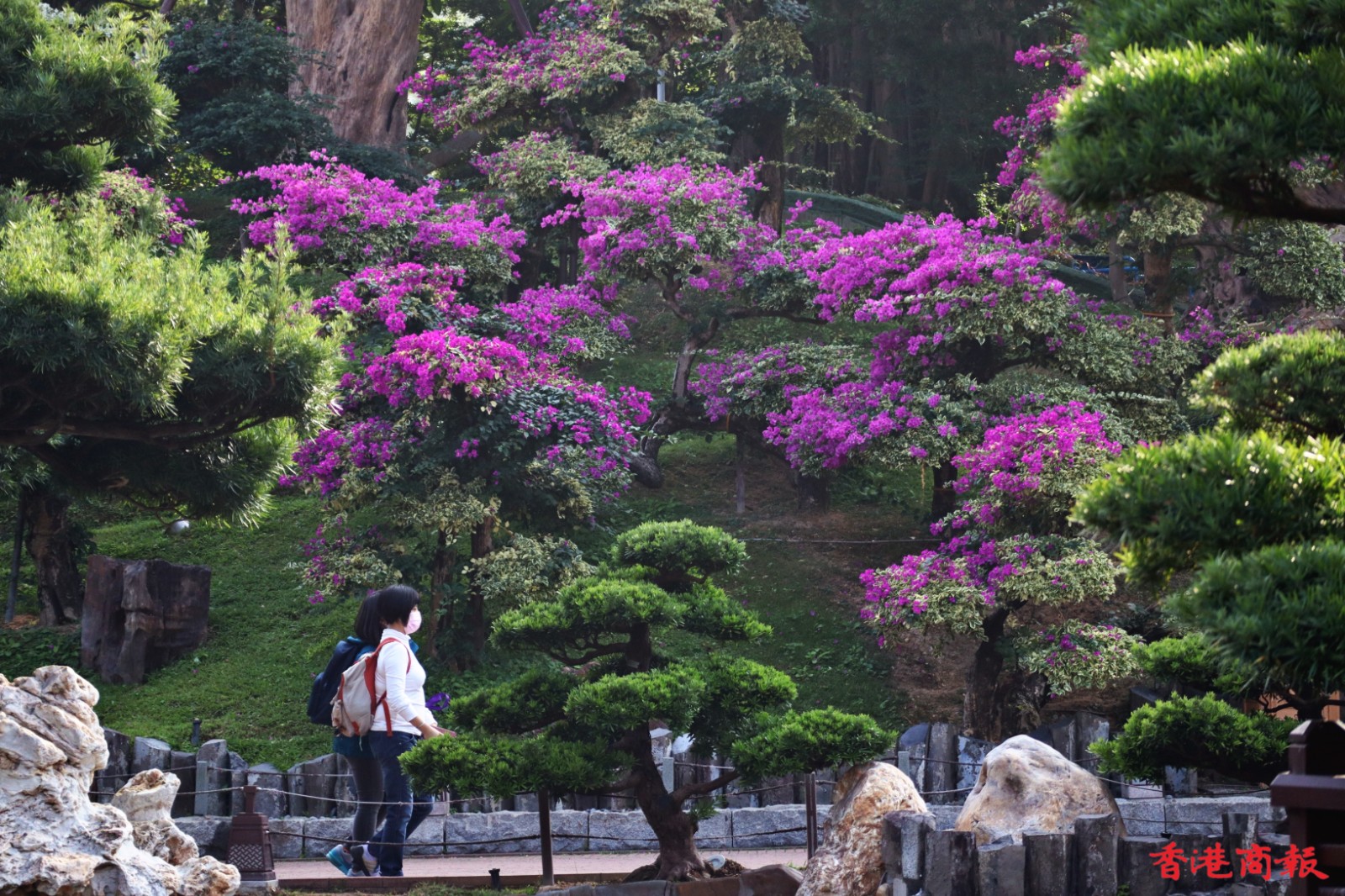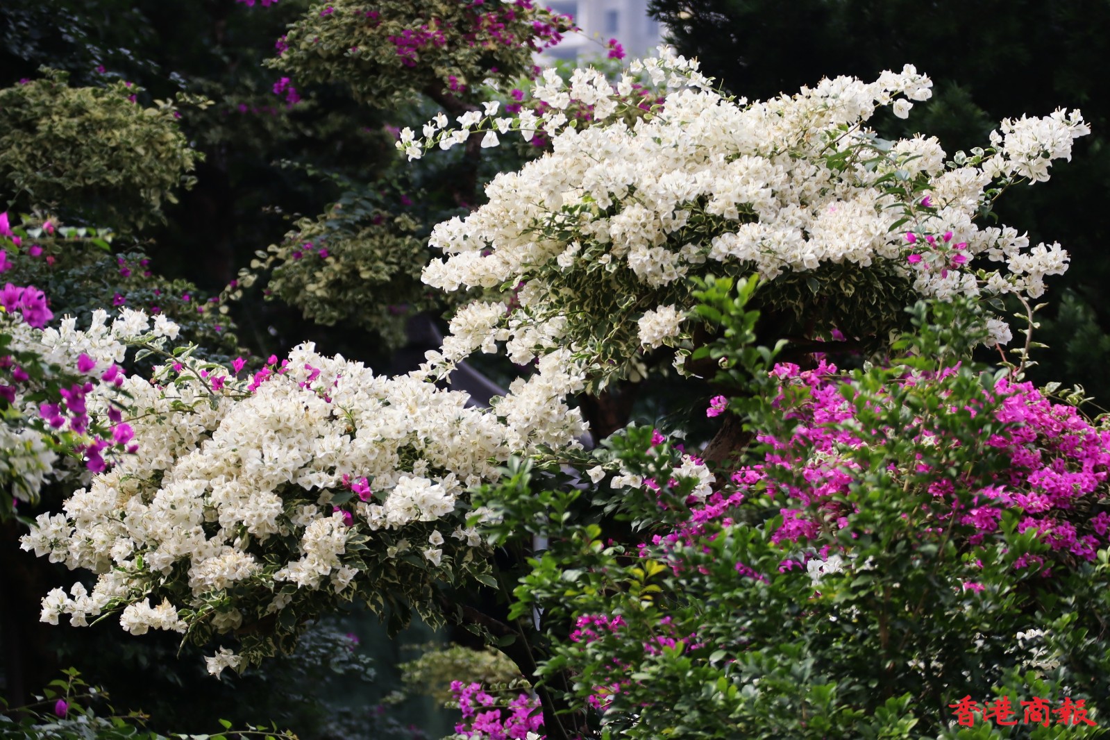 南蓮園池的簕杜鵑則種在行人路旁,有鮮紅色、粉紅色、白色,與園內的綠色植形成強烈對比,萬綠叢中一點紅,美不勝收,結合亭台樓閣構成絕色美景。(馮瀚文 攝)